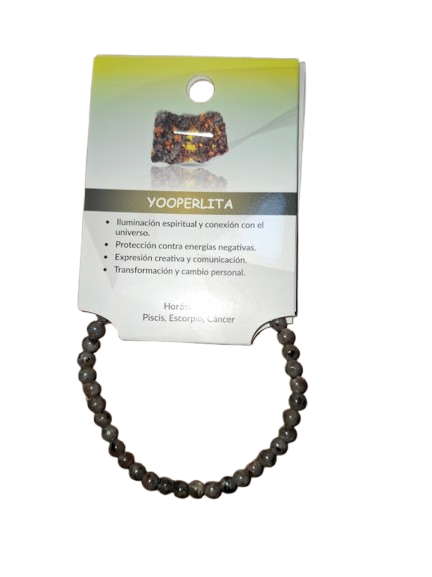 La pulsera de Yooperlita es un mineral único conocido por su energía de protección, equilibrio y activación espiritual. Es un abrecaminos energético, ayudando a desbloquear situaciones estancadas, atraer nuevas oportunidades y fomentar el crecimiento personal.