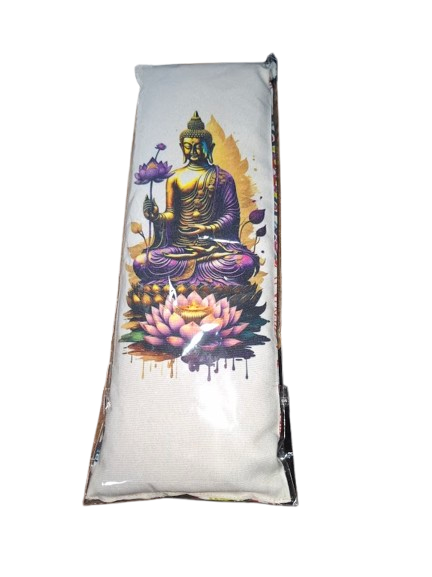 Saco térmico de semillas naturales, decorado con ilustraciones inspiradas en Buda, símbolo de calma, conciencia y equilibrio interior.