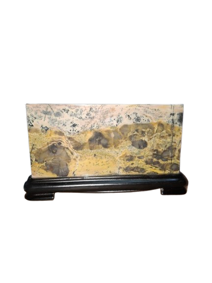 Placa rectangular de ágata árbol, de aproximadamente 8 x 12 cm, presentada sobre base fija, lo que le aporta estabilidad y la convierte en una pieza lista para exhibir.