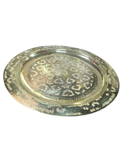 Esta bandeja de latón en color dorado, con delicados grabados de estilo árabe, es una pieza decorativa única que aporta calidez, luz y un toque exótico a cualquier espacio. Su acabado labrado refleja la luz de forma especial, creando una atmósfera acogedora y sofisticada.
