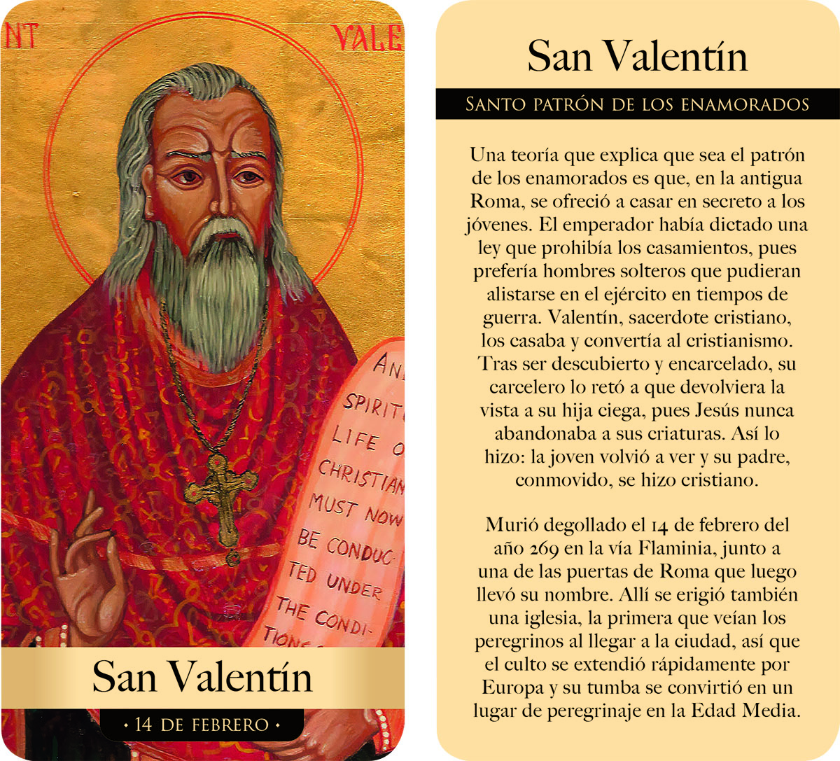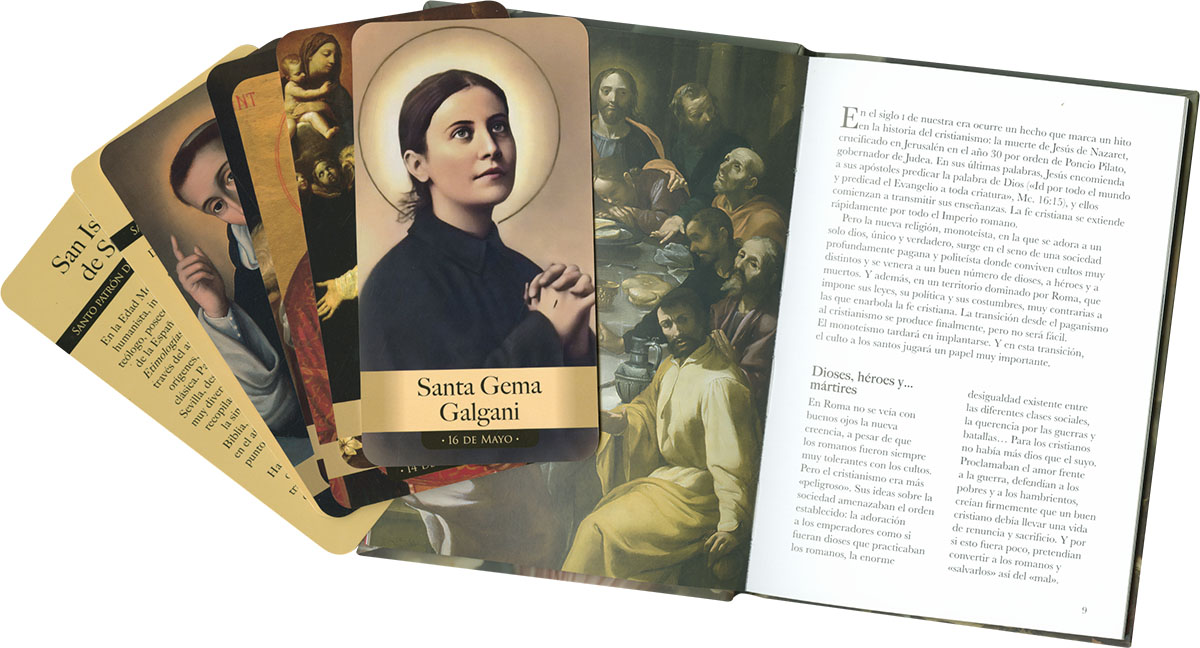 Caja que contiene 40 estampas de santos del cristianismo, representados en hermosas obras pictóricas, acompañadas de un libro de 80 páginas que recoge su vida, ejemplo y enseñanzas.