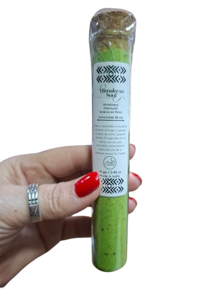 Este incienso en polvo, presentado en una delicada probeta de cristal con tapón de corcho, forma parte de una colección diseñada para trabajar diferentes intenciones energéticas de forma práctica y consciente. Su color verde está asociado al equilibrio, la conexión y la energía vital.