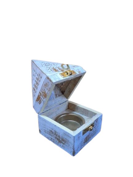 Esta caja en forma de pirámide, fabricada artesanalmente, es una pieza única y funcional diseñada específicamente para quemar sahumerios o incienso en grano. Hecha con un acabado en blanco decapado, su aspecto envejecido y rústico le confiere un encanto especial, ideal para quienes buscan una estética natural y artesanal en su decoración.