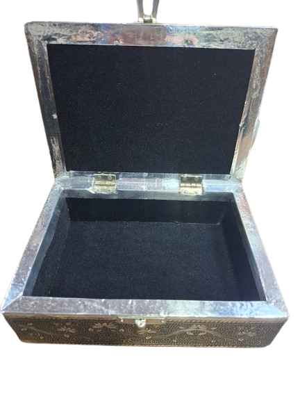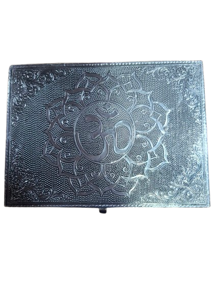 Esta elegante caja rectangular combina estética, funcionalidad y simbolismo. Su exterior metálico está repujado con flores y cenefas, destacando un símbolo Omm en el centro, que aporta armonía y energía positiva al espacio.