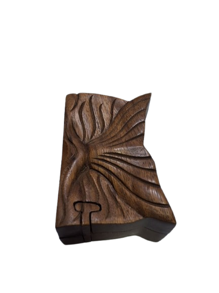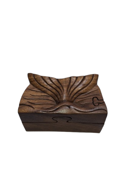 Caja secreta de madera con forma rectangular, diseñada como un delicado secreter de apertura tipo puzle. Su tapa presenta una hermosa talla en relieve que recuerda la cola de una sirena, aportando un toque mágico y artesanal. Para abrirla, hay que deslizar y desencajar sus piezas en el orden correcto, haciendo que descubrir su interior sea toda una experiencia.