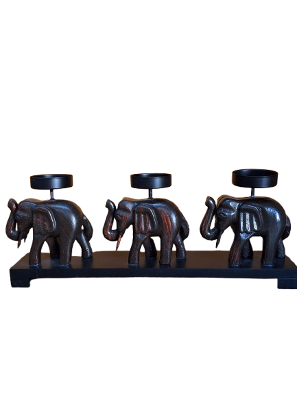 Da un toque emblemático y místico a tu hogar o lugar de trabajo ,este candelabro para tres velas fabricado en madera y metal,es sin duda una bonita idea de decoración.Por muchos es sabido, que los Elefantes con la trompa hacia arriba dan buena suerte y fortuna.