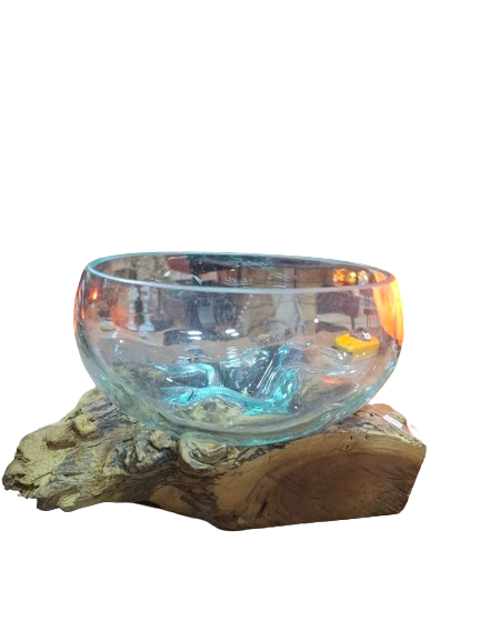 Pieza decorativa que combina la pureza del cristal con la calidez de la madera natural. Este cuenco de cristal transparente, con suaves tonos azulados en su interior, descansa sobre una base de madera con forma orgánica, creando una composición única y artesanal.
