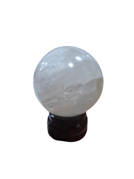 Bola o esfera de selenita natural, de aproximadamente 10 cm de diámetro, acompañada de base independiente para apoyarla con estabilidad y lucirla como merece.