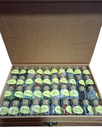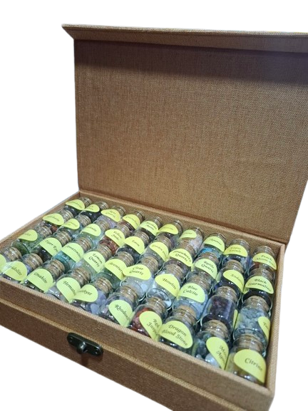 Este estuche contiene 40 tarritos de cristal con tapón de corcho, cada uno lleno de chips de minerales naturales diferentes. Una pieza preciosa tanto para coleccionistas, amantes de la energía de los cristales, como para quienes disfrutan de rituales, decoración o manualidades con minerales.