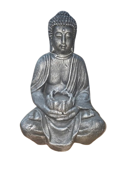 Buda en resina gris plata – Figura decorativa y espiritual