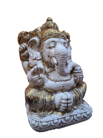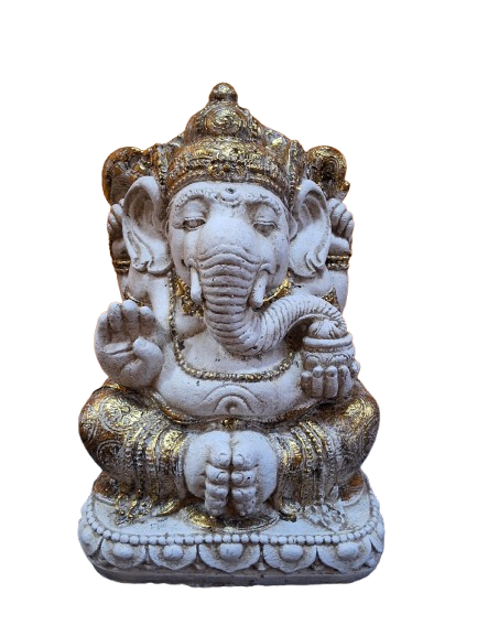 La textura natural del **hormigón** le otorga un aspecto moderno y minimalista, mientras que los detalles en **oro** o **plata** añaden un toque refinado y elegante, resaltando los intrincados detalles de Ganesha, como su corona, adornos y atributos sagrados. Perfecta para decorar interiores o exteriores protegidos, esta figura de Ganesha es una pieza ideal para altares, jardines o espacios dedicados a la meditación.