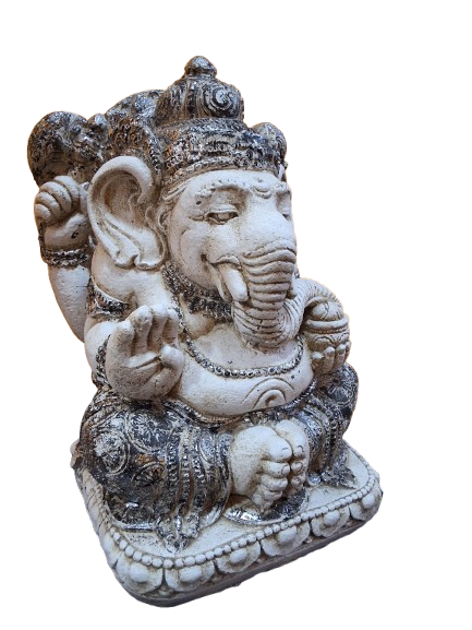Esta impresionante figura de **Ganesha**, el dios hindú de la sabiduría, la prosperidad y la eliminación de obstáculos, está elaborada en **fibrohormigón**, un material robusto que garantiza su durabilidad y resistencia. Disponible en dos elegantes acabados: **hormigón natural combinado con detalles dorados** o **hormigón natural con detalles plateados**, esta figura aporta una sensación de serenidad y espiritualidad a cualquier espacio.
