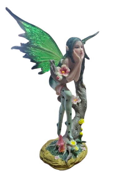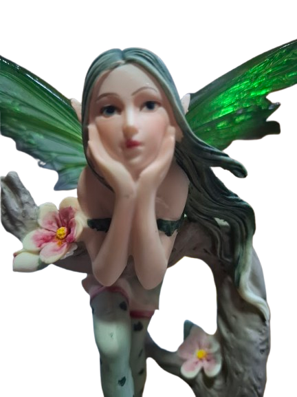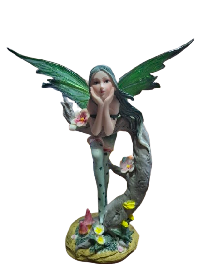 Figura de hada elaborada en resina, representada en una postura serena y contemplativa, apoyada suavemente sobre el tronco de un árbol. Su expresión delicada y su gesto pensativo evocan un momento de pausa, invitando a mirar hacia el interior.