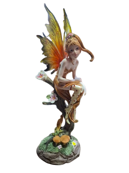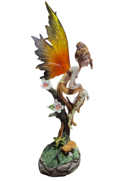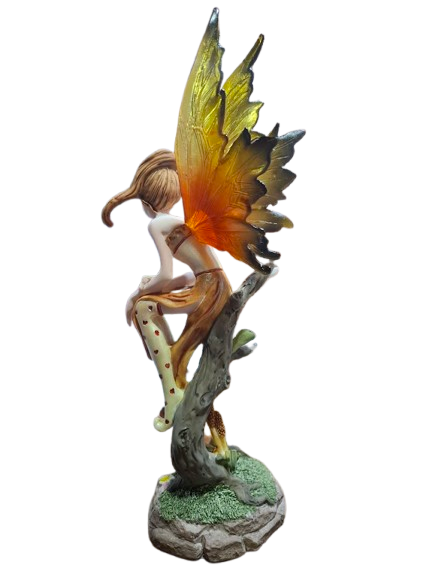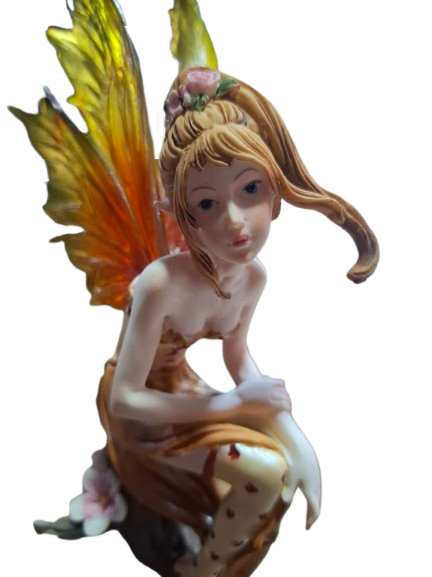Figura de hada elaborada en resina, representada en una delicada postura sentada sobre un tronco, con gesto suave y mirada cercana. Su expresión transmite ternura y conexión emocional, evocando la belleza de sentir sin barreras.