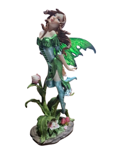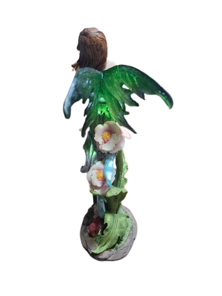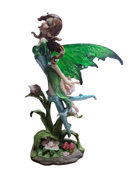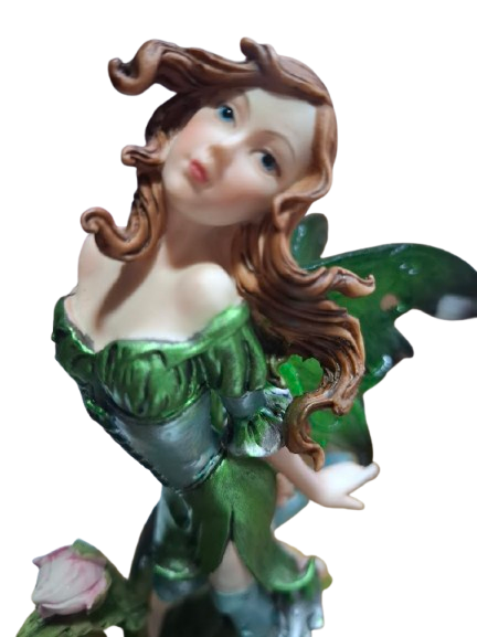 Vestida en tonos verdes, con alas recogidas hacia atrás y cabello largo castaño suelto, esta pieza transmite ligereza, libertad y conexión con la energía natural.