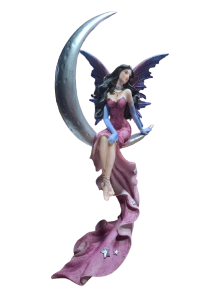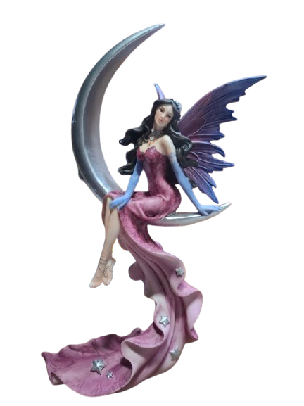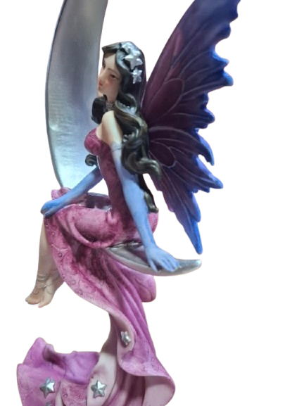 Figura de hada elaborada en resina, representada sentada delicadamente sobre una media luna en tono plateado. Su postura elegante, con las piernas suavemente cruzadas y el cuerpo relajado, transmite serenidad y conexión con los ciclos naturales.