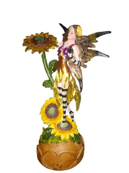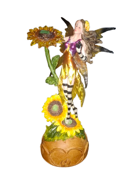 Figura de hada elaborada en resina, representada sentada sobre girasoles con una postura delicada y equilibrada: un pie apoyado firmemente en el centro del girasol y el otro de puntillas sobre las hojas, transmitiendo ligereza y gracia.
