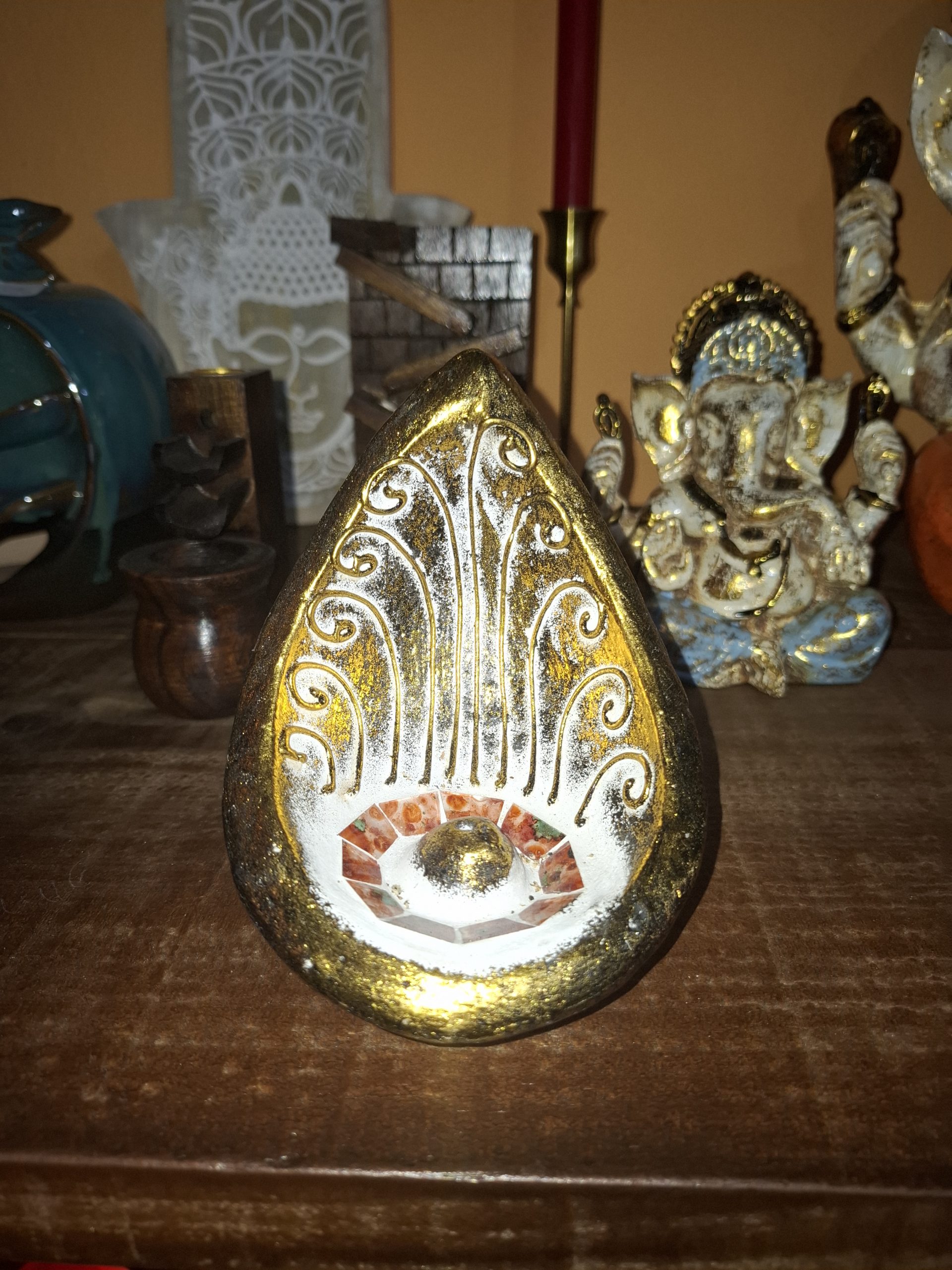 Este portainciensos de cerámica tiene un diseño elegante en forma de gota, con acabado dorado, relieves blancos de estilo ornamental y un cristal central que le da un toque espiritual y decorativo muy especial.