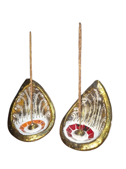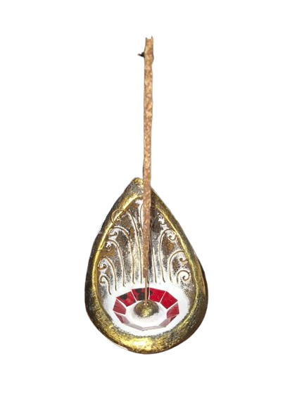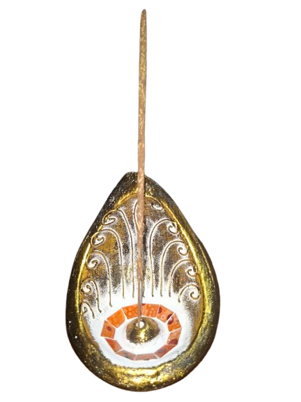 Este portainciensos de cerámica tiene un diseño en forma de gota, con acabado dorado, relieves blancos de estilo ornamental y un cristal central que le da un toque espiritual y decorativo muy especial.