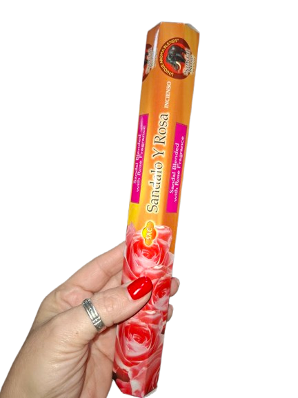 El incienso masala de sándalo y rosa combina la profunda calidez del sándalo con la fragancia delicada y amorosa de la rosa, creando un aroma equilibrado que armoniza emociones, atrae amor y favorece la paz interior.