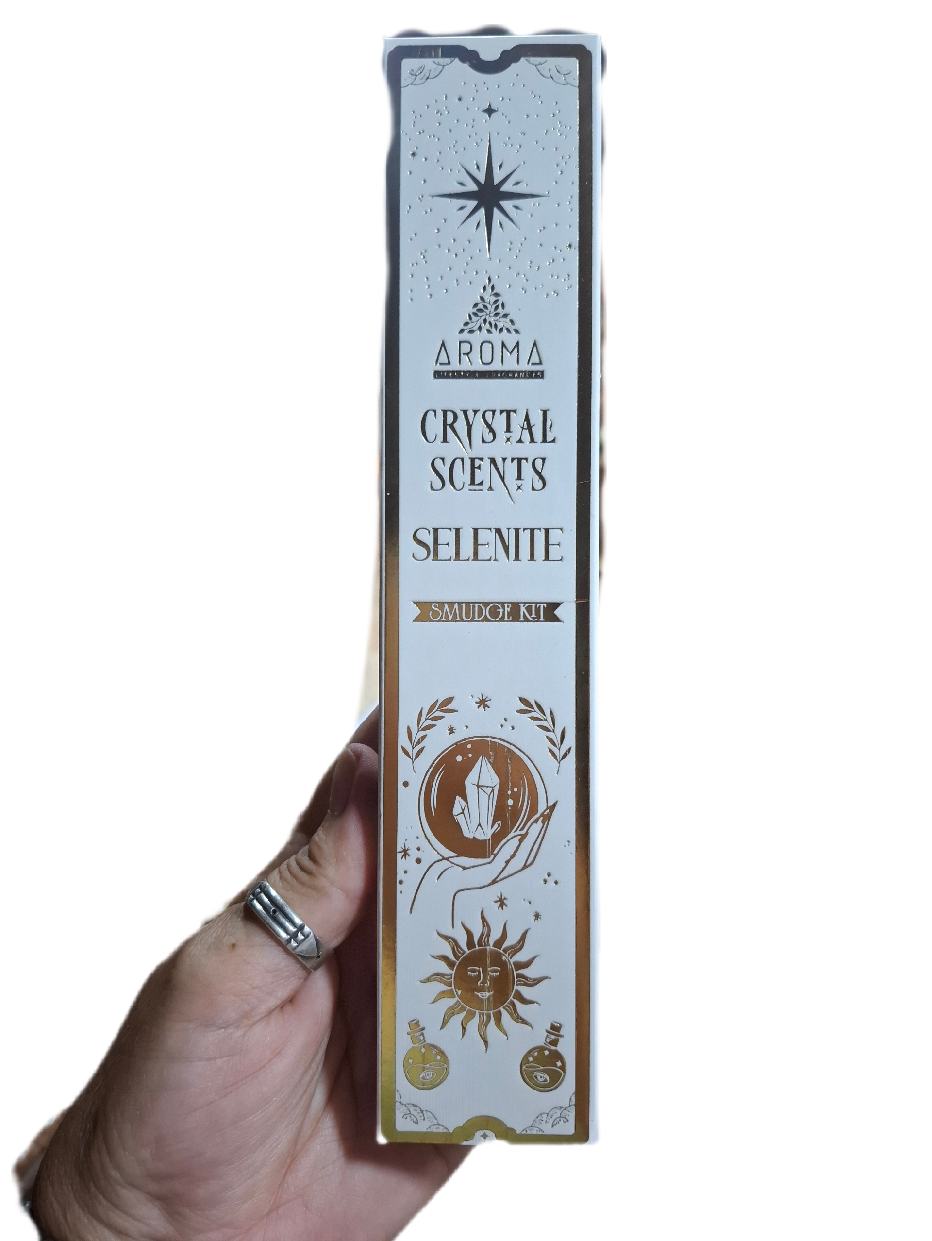 Este incienso en varillas ha sido elaborado al estilo tradicional masala, con resinas, hierbas y aceites naturales, e infusionado con chips reales de selenita, un mineral conocido por su poderosa energía espiritual.