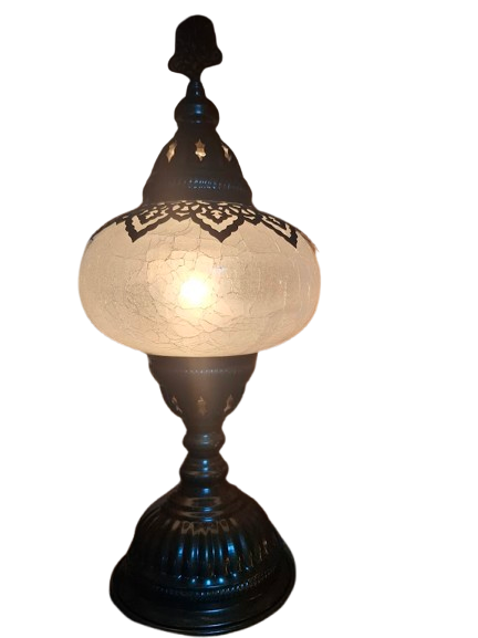Elegante lámpara turca de sobremesa con base metálica ornamentada y tulipa de cristal craquelado en tonos claros. Su diseño combina la belleza del metal trabajado con el efecto del cristal agrietado decorativo, creando una iluminación cálida y muy acogedora cuando se enciende.