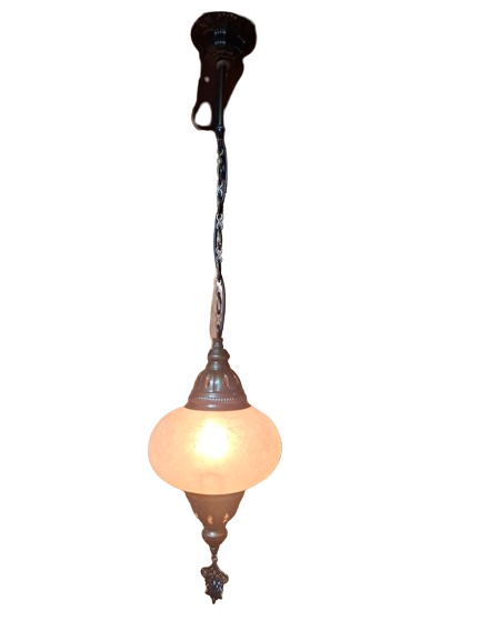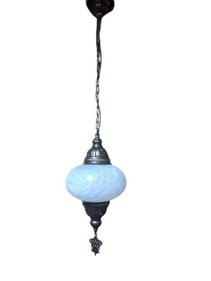 Elegante lámpara turca de techo compuesta por una tulipa decorativa de cristal blanco con efecto craquelado. Su diseño sencillo y sofisticado permite que la luz se filtre a través del cristal creando una iluminación cálida y muy acogedora.
