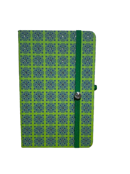 Bonita libreta de tapa dura con un diseño decorativo muy original. La portada presenta un fondo en tono verde pistacho con un estampado que recuerda a pequeños mosaicos o cuadrados en color azul, cada uno con un detalle brillante en el centro, aportando un toque elegante y llamativo.