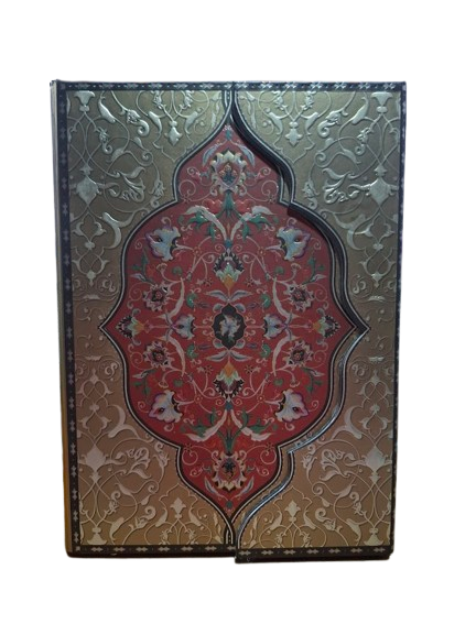 Libreta de pasta dura con un diseño ornamental elegante en tonos tierra, dorados y burdeos. Su portada presenta un patrón decorativo con inspiración clásica, con detalles florales y arabescos que le aportan un estilo sofisticado y atemporal.