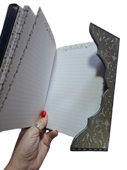 Cuenta con una original pestaña lateral con cierre magnético, que protege el interior y le da un acabado distintivo. En su interior, las hojas son lisas con líneas suaves, decoradas con delicados detalles en los márgenes que mantienen la armonía estética de la libreta.
