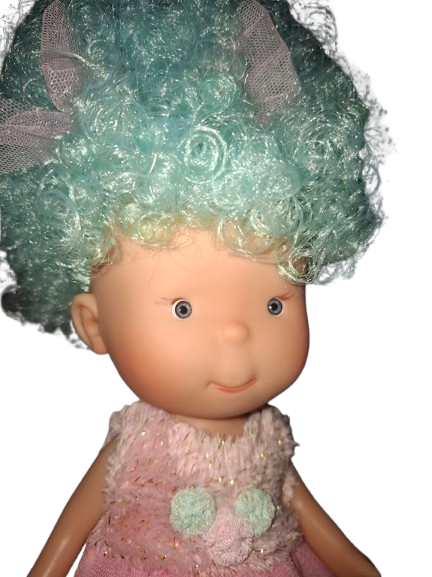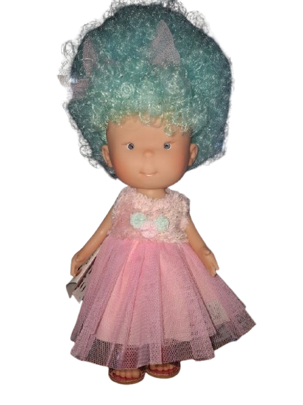 Esta versión destaca por su cabello rizado en color azul turquesa, voluminoso, brillante y con lacitos a juego que aportan un toque mágico y fantasioso. Viste un vestido rosa de tul y encaje, con cuerpo decorado en flores suaves y falda vaporosa de varias capas. Un diseño delicado que combina a la perfección con su aspecto tierno y encantador.