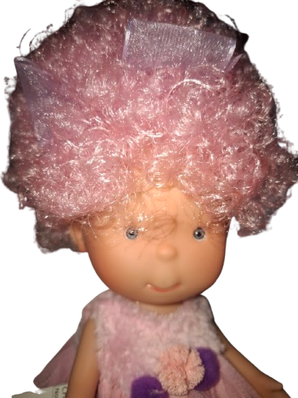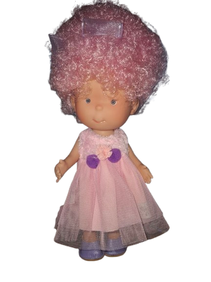 Destaca por su cabello rosa esponjoso, con textura brillante y un volumen que le aporta un toque mágico y fantasía. Viste un delicado vestido en tonos pastel, confeccionado en tela suave y detalles de encaje, y combina con unos zapatos morados que completan un look adorable, moderno y muy fotogénico.