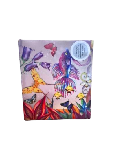 Original cuadernillo de tapa dura con un diseño alegre y colorido inspirado en la naturaleza. La portada presenta una ilustración con peces, mariposas y flores, en tonos amarillos, morados, azules y rosados, creando una combinación muy viva y delicada. El dibujo tiene además un ligero relieve, lo que aporta textura y un toque especial al diseño.