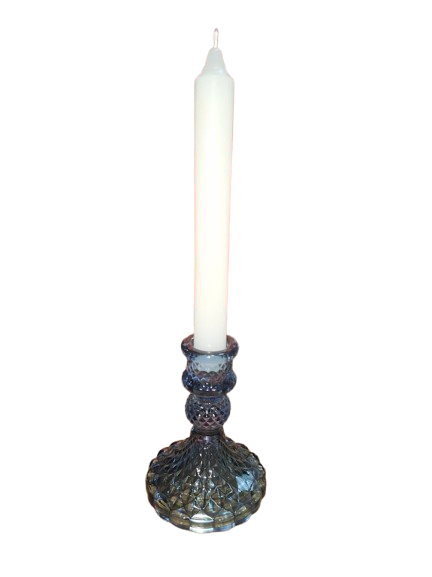 Elegante portavelas tipo candelero elaborado en cristal labrado, diseñado especialmente para velas largas tipo bujía. Su forma permite colocar la vela en la parte superior del soporte, introduciendo únicamente la base para mantenerla firme y estable.