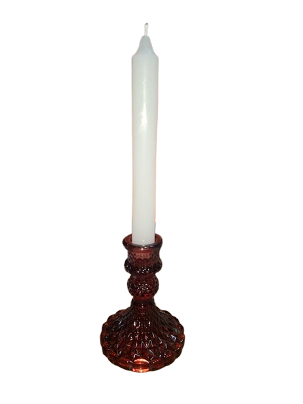 El cristal es transparente con color, lo que le aporta un toque decorativo muy bonito incluso cuando la vela no está encendida. Su acabado tallado o labrado le da un estilo clásico y elegante, ideal para altares, decoración del hogar, mesas especiales o trabajos rituales con velas.