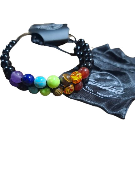 Pulsera formada por dos filas iguales, combinando ónix negro con las cuentas representativas de los 7 chakras. Su diseño elegante y protector la convierte en una pieza ideal para llevar cada día.