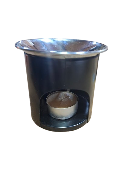 En la parte trasera hay una abertura donde se coloca una vela de té, que alimenta el calor necesario para derretir las ceras o esencias sin riesgo de contacto directo con la llama.