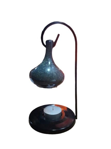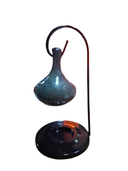 Quemador de esencias con recipiente cerámico de forma estilizada y suspendido en soporte metálico negro. Su diseño minimalista y elegante lo convierte en una pieza decorativa además de funcional.