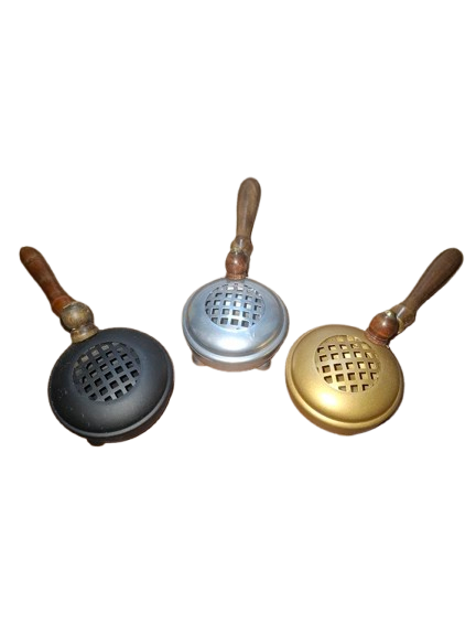 Este quemador de metal con mango de madera es una herramienta versátil y segura para rituales, limpiezas energéticas y aromaterapia. Su diseño con tapa perforada permite que el humo salga suavemente mientras controla brasas, chispas y cenizas, evitando accidentes y dejando tus manos libres de quemaduras gracias al mango aislado.