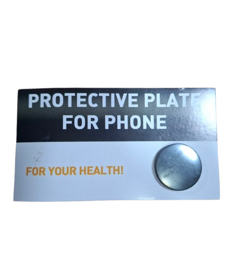 Pequeña pieza de Shungita natural en forma circular, con adhesivo en la parte posterior, diseñada para colocar fácilmente en dispositivos electrónicos como móviles, tablets, ordenadores o routers WiFi.