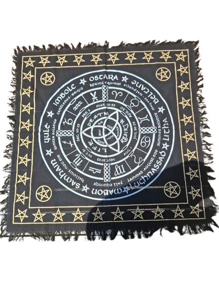 Este tapete de 40×40 cm está confeccionado en algodón fino sobre fondo negro, ofreciendo un soporte suave y elegante para tus prácticas espirituales, rituales o lecturas de cartas. Su diseño combina varias simbologías sagradas con un borde de estrellas doradas y los símbolos de los horóscopos, creando un ambiente lleno de energía y conexión cósmica.