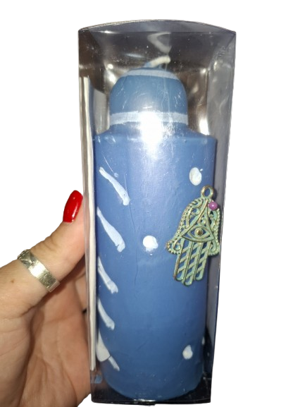 El velón incluye un **dije real de la Mano de Fátima**, que puede usarse posteriormente como talismán personal, colgarse en la entrada del hogar, en el bolso o llevarlo contigo como defensa energética diaria.