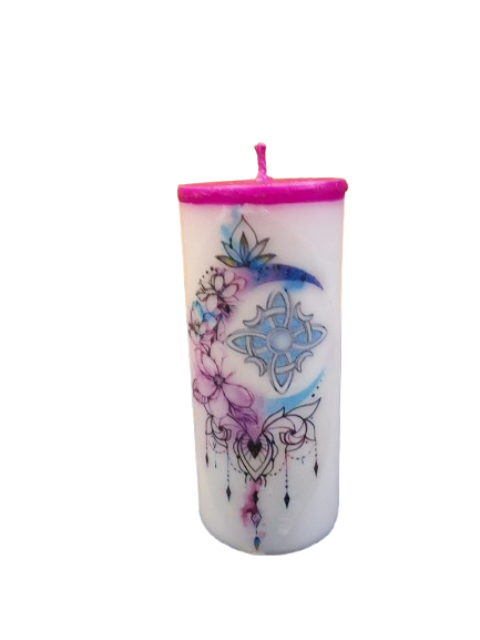 El **velón de Protección** con detalles únicos como un atrapasueños en forma de luna y un nudo de brujas es ideal para rituales de protección energética y espiritual. El color blanco simboliza la pureza y la paz, mientras que el fucsia en la parte superior aporta energía positiva y vibrante. Este velón está hecho con aceite de coco, lo que ayuda a purificar el ambiente y promover una combustión suave y uniforme.